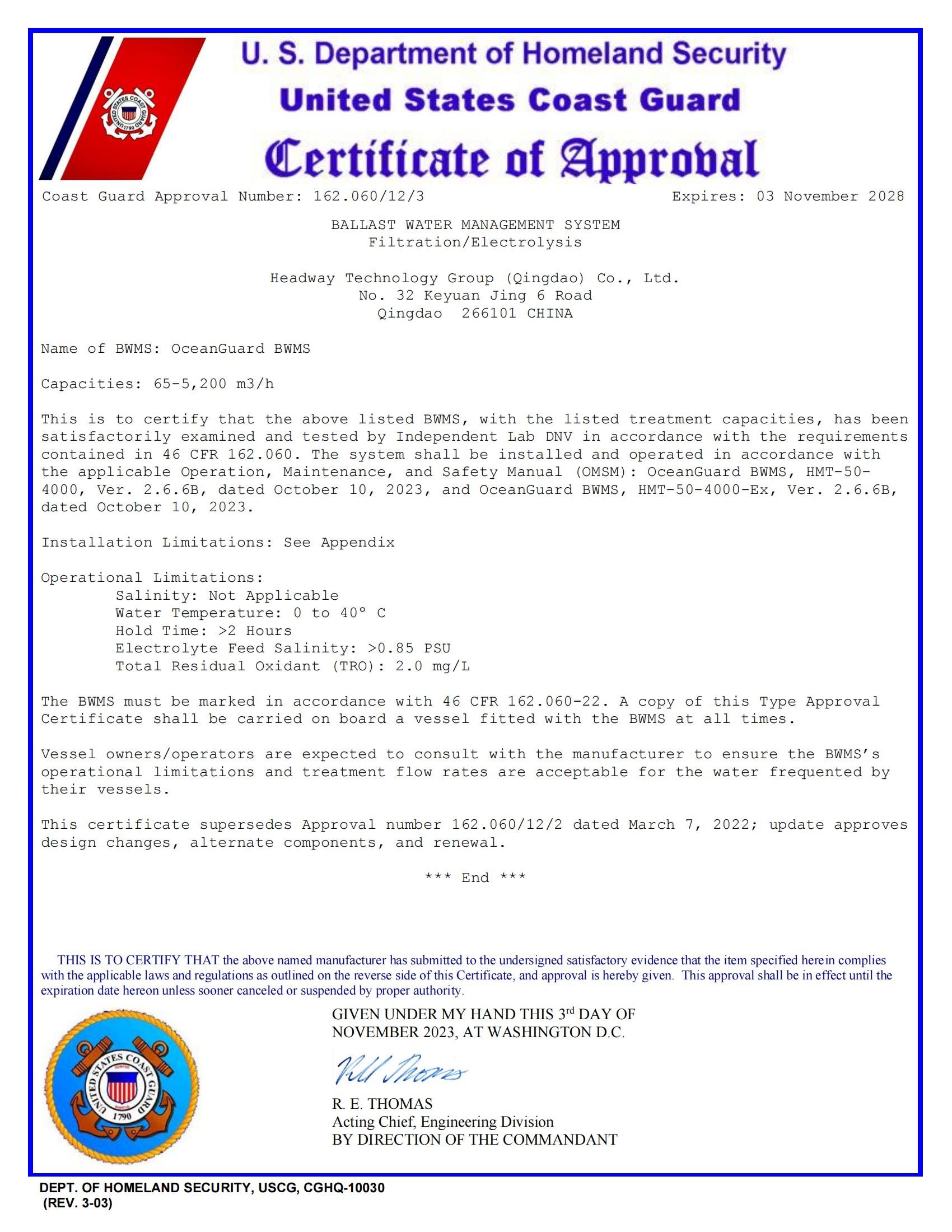 海洋衛士?壓載水管理系統(BWMS)采用“電催化高級氧化技術”,具有單次處理、體積小、無氫氣、超低能耗,以及不受水域鹽度、溫度、濁度影響等優勢。系統擁有涵蓋近20個主流船級社和船旗國在內的全面認證,訂單量與市場份額穩居世界前列。