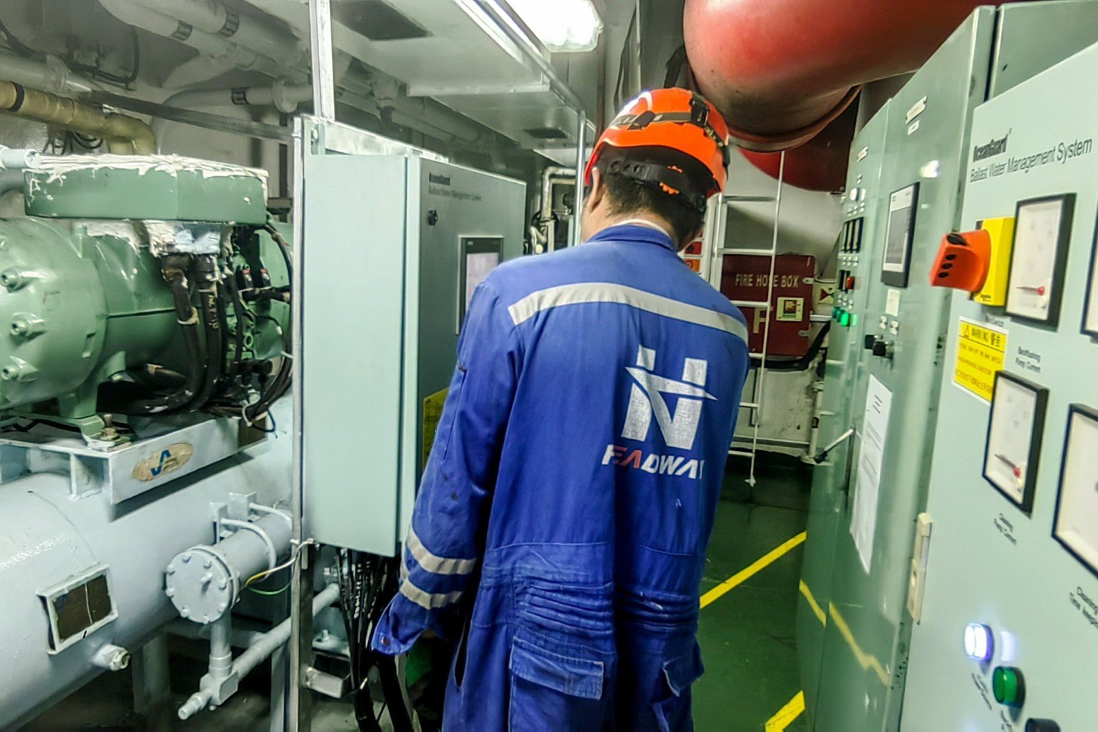 圖為海德威工程師在AM PARADISE輪上調(diào)試設(shè)備